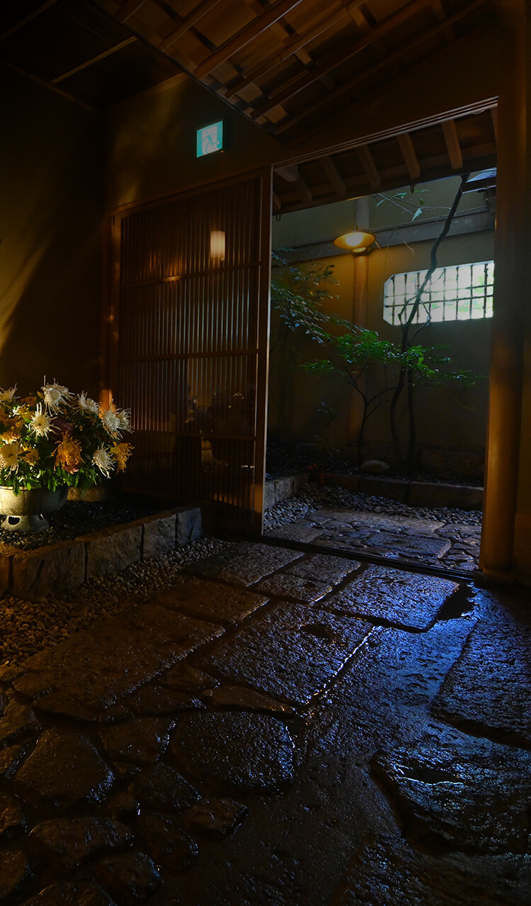 玄関を入った待合の先には、畳敷きのカウンター席があり、奥には離れのような8畳の座敷と、二階には建仁寺の正門がみえるお部屋がございます。